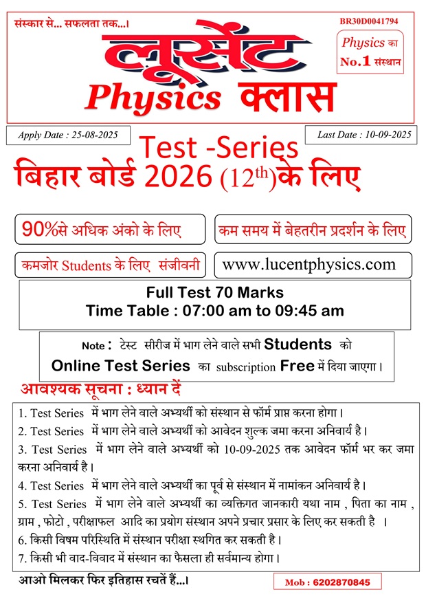 29-OCt-2023 12th Test Examination Full Marks : 70 Test Time : 07:00 am to 09:45 am Syllabus: Physics Part 1 Objective +Subjective = 70   2023-10-09 07:24:32